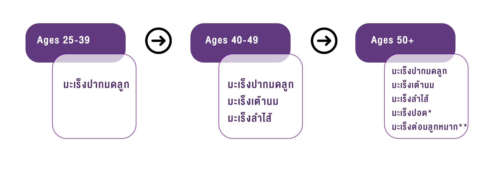อ้างอิงจากแนวทางการตรวจคัดกรองมะเร็ง American Cancer Society แนะนำการตรวจคัดกรองมะเร็ง ผู้ที่ไม่ได้มีปัจจัยเสี่ยงเป็นพิเศษ (Average Risk) การตรวจคัดกรองมะเร็งขั้นพื้นฐานที่แนะนำ แบ่งตามอายุ ดังนี้